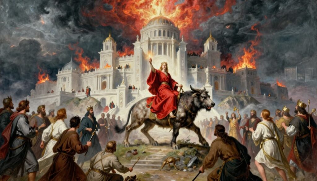 Revelation 17–18 describes a “great prostitute” riding a beast, seated on many waters, dressed in purple and scarlet, holding a golden cup. She is rich, powerful, and popular with kings and merchants.