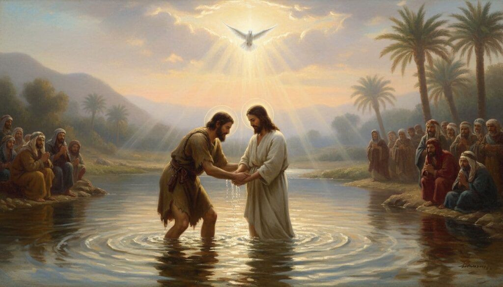 Jesus baptized in the Jordan as the Holy Spirit descends, a visual reminder of His public anointing.